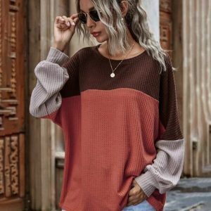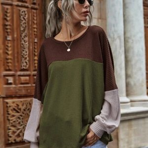Boho Waffle Knit Oversized Pullover Plus Size, Minimalist Long Sleeve Color Blocks Loose Fit Hoodie Shirt, Comfy Outfit, Gifts for Her