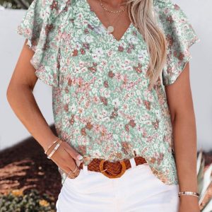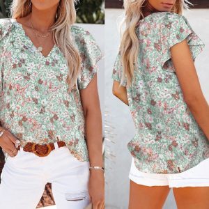 Women’s Short Sleeve Floral Boho Blouse, Ruffled Sleeve V Neck Shirt Top, Black, Green, Gray, Red, Gift for Her, Boho Clothing
