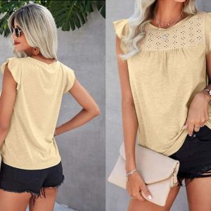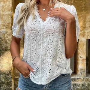 Woman Summer Lace V Neck Blouse Plus Size & Petite, Minimalist Short Sleeve Shirt, Casual Top, Vacation Outfit, Green, White, Yellow, Black
