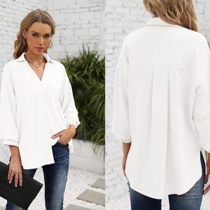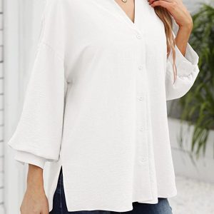 Minimalist Women’s Solid Button Down Top, Loose Fit Long Balloon Sleeve V Neck Blouse, Business Casual White, Black, Blue, Office Clothes