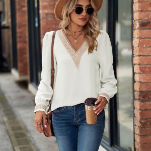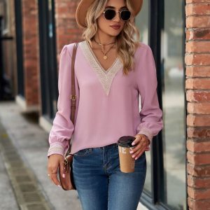 Women Minimalist Long Sleeve Shirt Blouse, Boho Lace Neckline Patchwork V Neck Top, Casual Loose fit, Gifts for Her, Pink, Blue, Beige