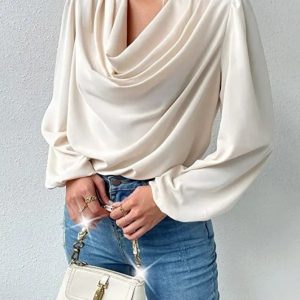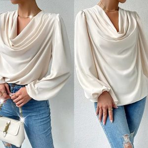 Women’s Minimalist Satin Long Sleeve Blouse, Solid Loose Fit Shirt Top, Gifts for Her, Beige, White, Blue, Pink, Purple, Black