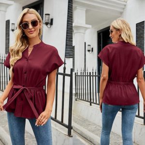 Women’s Minimalist Short Sleeve Linen Blouse, Summer Cotton Button Down, Work Clothes, Gift for Her, Slim Fit, White, Blue, Burgundy